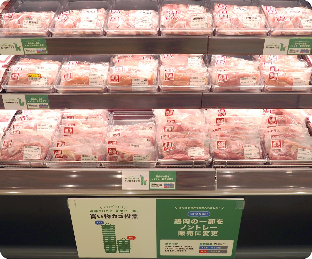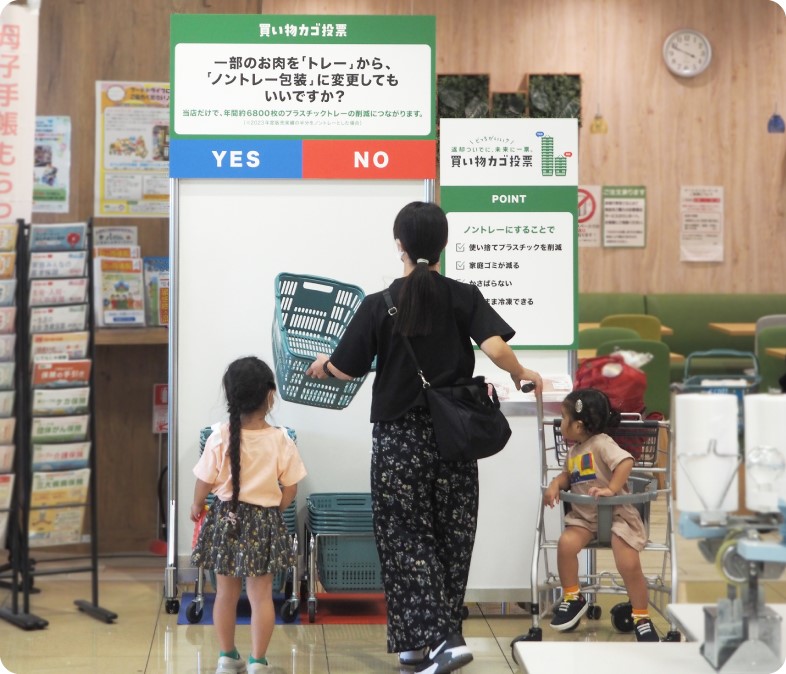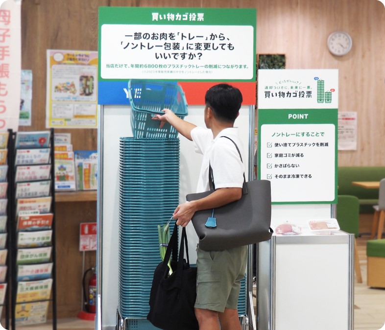 우리는 매일 소비를 통해 세상을 바꿀 힘을 가지고 있습니다. 일본 WWF는 장바구니 반납 시 간단한 투표를 통해 소비자의 목소리를 반영하는 시스템을 만들었습니다. 소비자들이 장바구니를 반납할 때 '예(Yes)' 또는 '아니오(No)'로 표시된 질문에 답하도록 유도하며, 이를 통해 슈퍼마켓이 고객의 의견을 반영한 지속 가능한 소비 방안을 모색하는 것입니다. 예컨데 고기 포장을 무포장으로 바꿀지 묻거나. 친환경상품코너를 별도로 만들지 매장 조명을 환경을 위해 조금 줄이는데 동의하는지 등입니다.