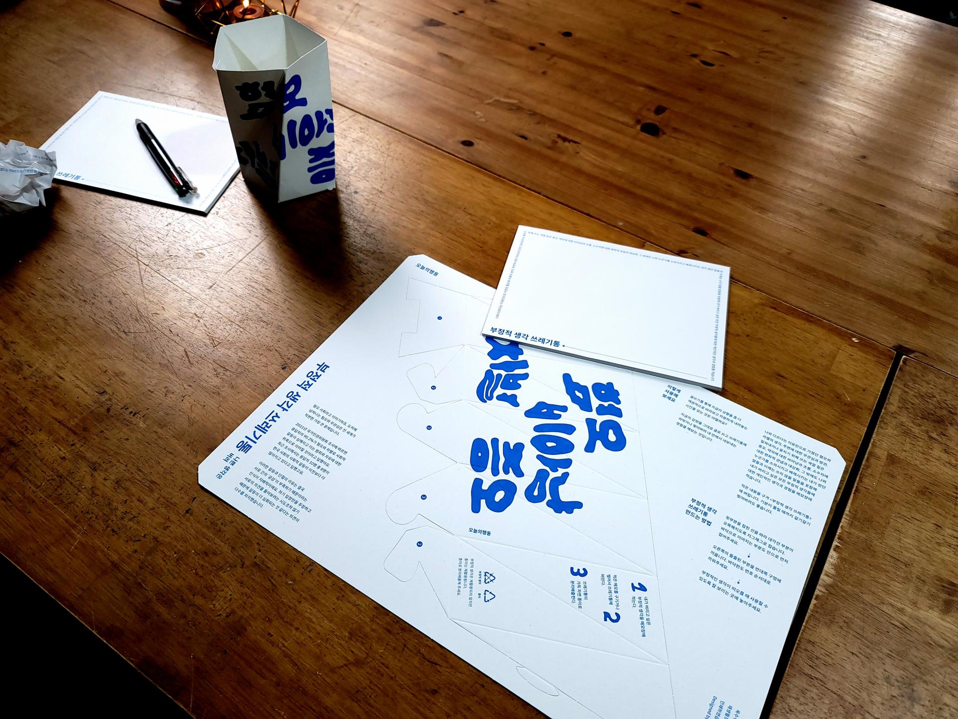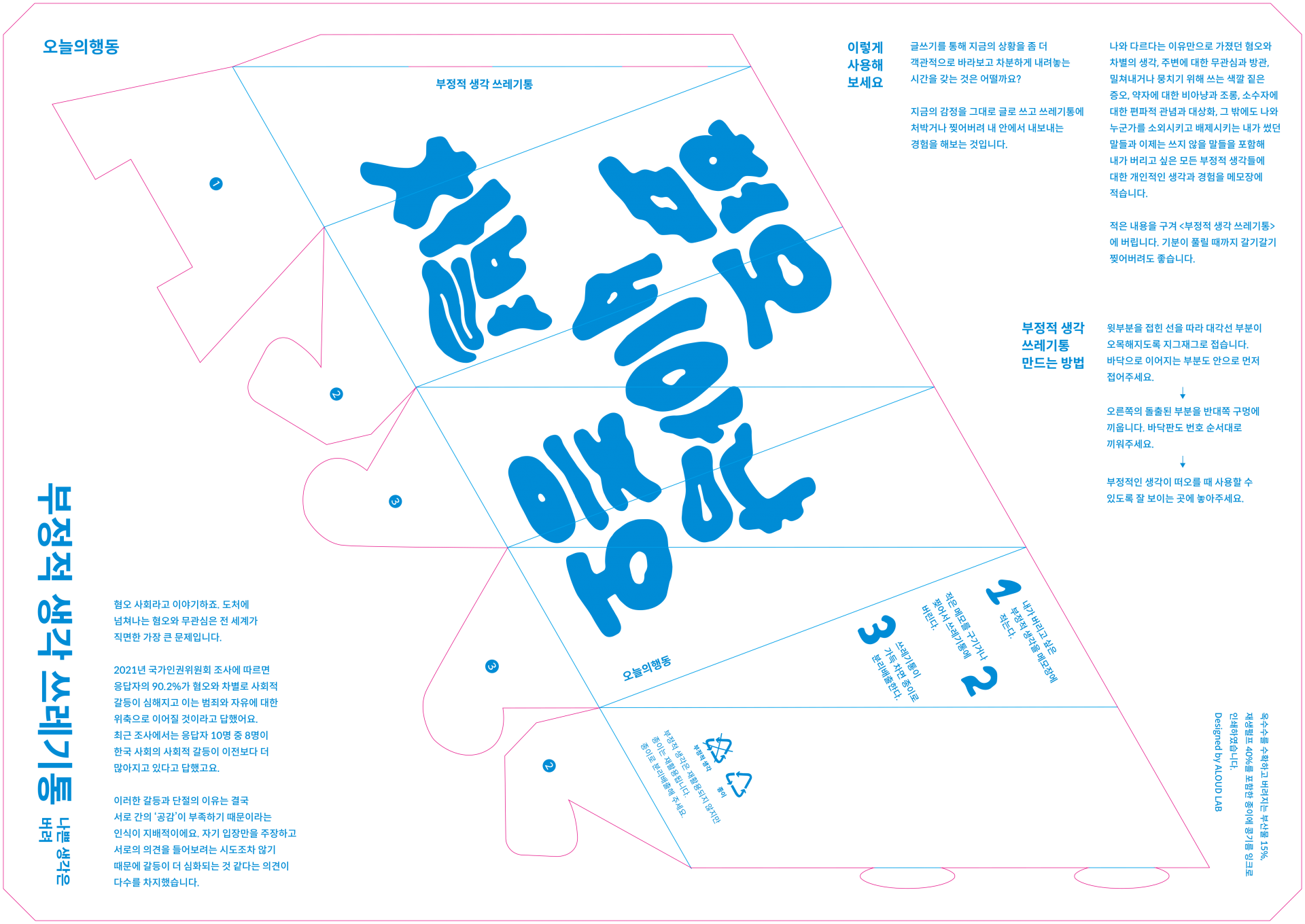 부정적 생각 쓰레기봉투는 누군가를 존재 자체로 미워하고 영혼까지 파괴하는 말과 글을 사용하지 않도록 다짐하는 행동을 돕는 도구입니다. 우리는 흔히 ‘나쁜 생각은 버려’라고 누군가를 격려하고 또 스스로 다짐합니다. 그래서 정말 그렇게 해보기로 했습니다. ‘부정적 생각 쓰레기봉투’는 글쓰기를 통해 나쁜 감정을 배출하는 쓰레기통입니다.